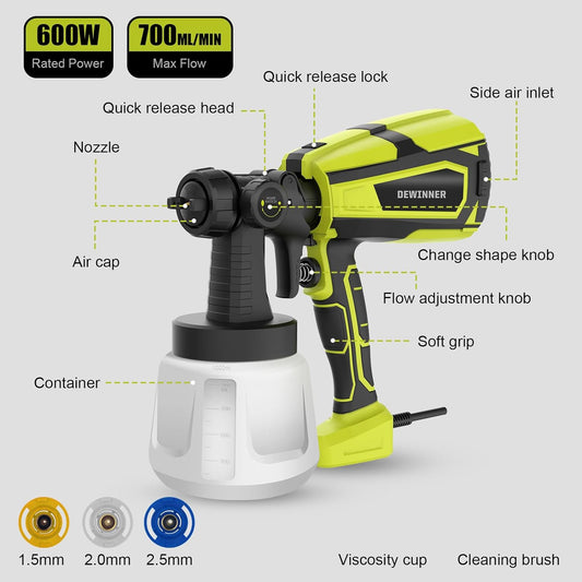 DEWINNER 600W Paint Spray Gun with 3 Spray Patterns, Electric Paint Gun with 1000ml Container, Paint Sprayer with 3 Nozzles (1.5/2.0/2.5mm) for Walls and Ceilings for DIY Decoration