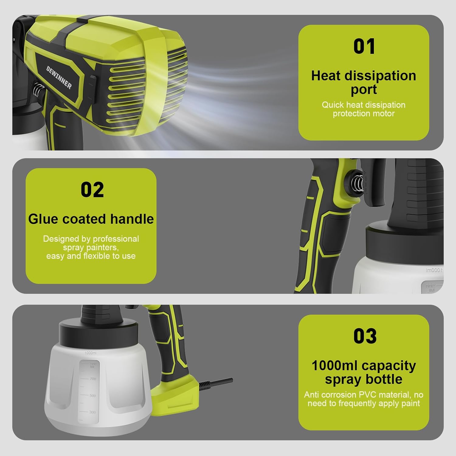 DEWINNER 600W Paint Spray Gun with 3 Spray Patterns, Electric Paint Gun with 1000ml Container, Paint Sprayer with 3 Nozzles (1.5/2.0/2.5mm) for Walls and Ceilings for DIY Decoration